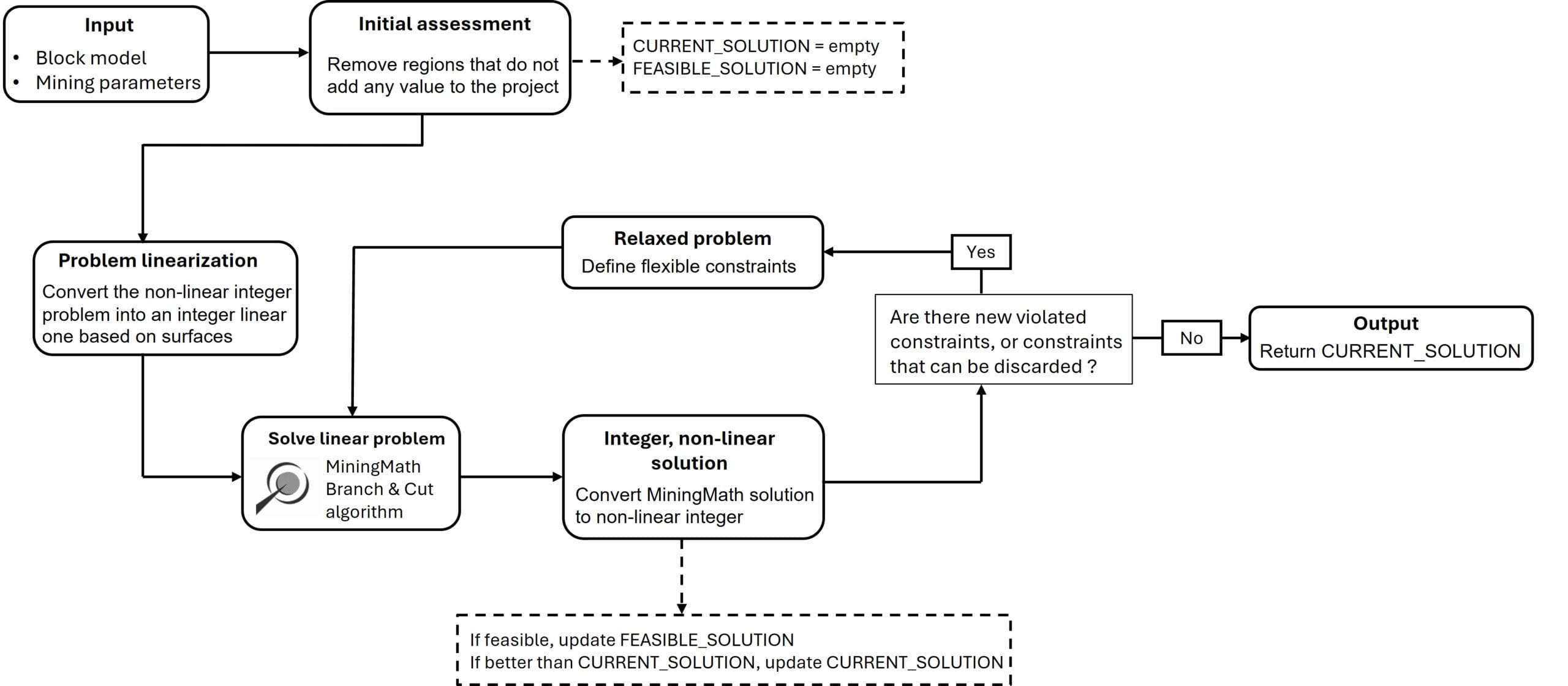 MiningMath emplea una formulación matemática innovadora y una potente propiedad Branch & Algoritmo de corte para problemas de optimización de minería. A continuación se proporciona una descripción de esta formulación matemática y los tres pasos principales del algoritmo empleado..