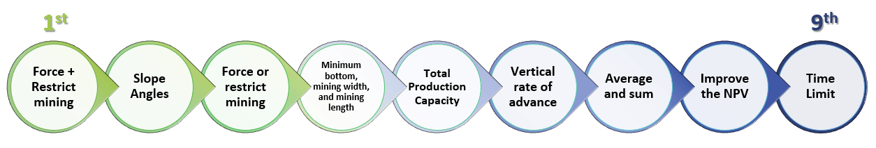 - Las superficies deben respetar los parámetros geométricos definidos por el usuario, como el ancho inferior mínimo, ancho mínimo de minería, longitud mínima de minado, y velocidad vertical máxima de avance, como se representa aquí.