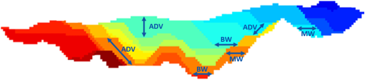 - \(H_x, hola, H_d\): diferencia máxima en elevación para celdas adyacentes en \(x\), \(y\) y direcciones diagonales