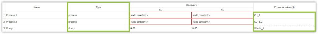 In the following example, columns CU_1 and CU_1.2 represent the economic values considering the default price for copper and an increase of 20% in this default price.
