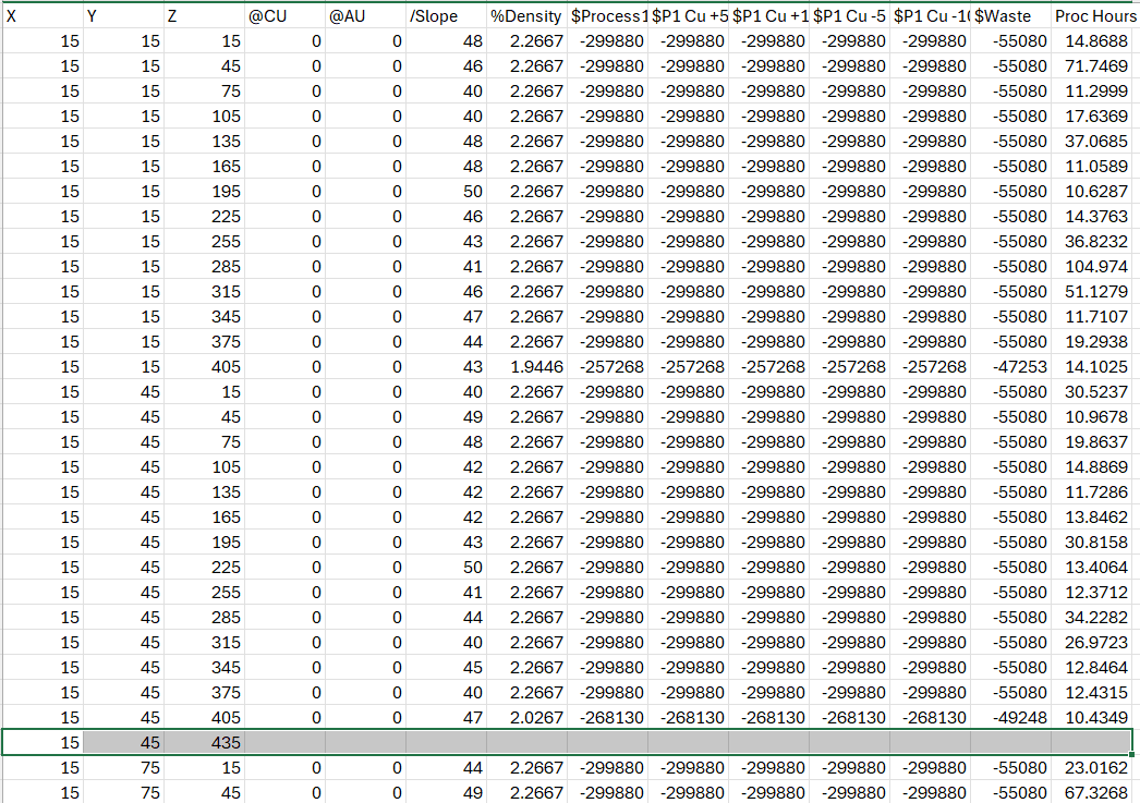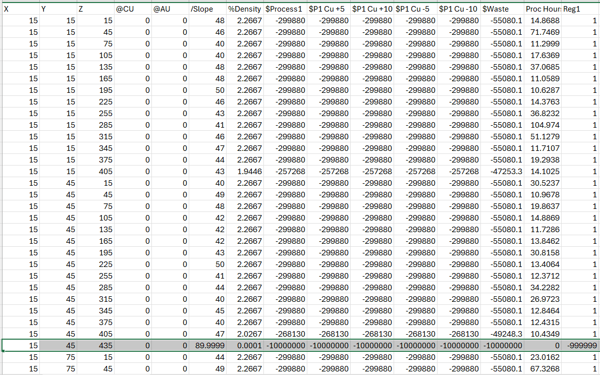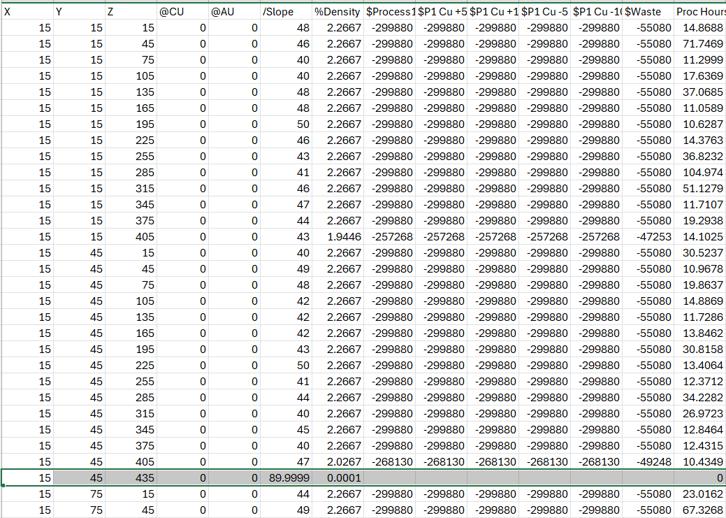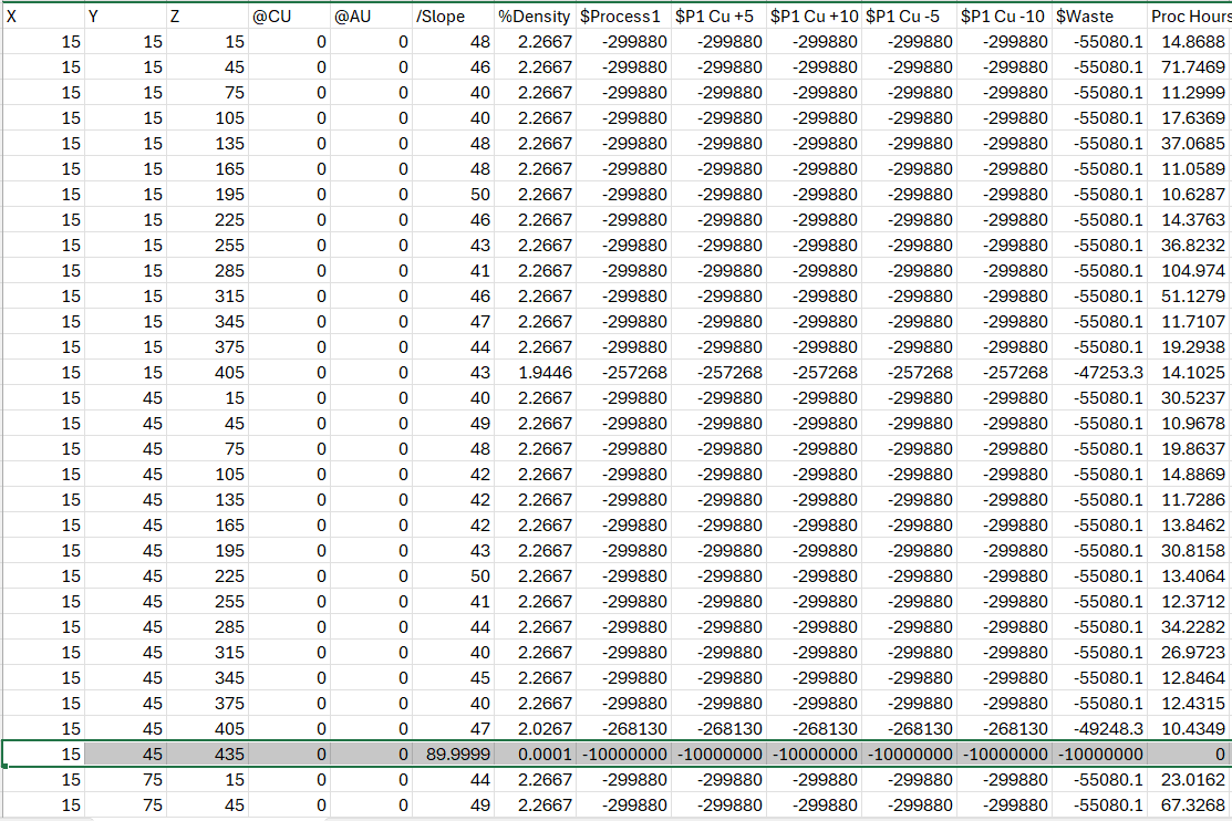 MiningMath también permite la optimización de pozos, con el objetivo de maximizar el flujo de efectivo no descontado, considerando los costos fijos y todas las restricciones deseadas. Esto permite una evaluación de viabilidad económica de regiones específicas a lo largo de la vida útil del proyecto.. Para hacer esto, Se debe utilizar el campo de decisión binario, que requieren configuraciones adicionales en el modelo de bloques y el escenario de optimización del pozo.