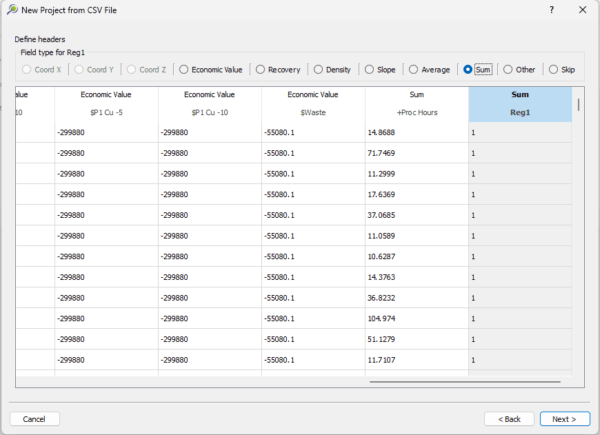 Realizar el modelo de bloques estándar importar. Durante la definición del tipo de campo, Establezca el campo de decisión creado como SUMA.