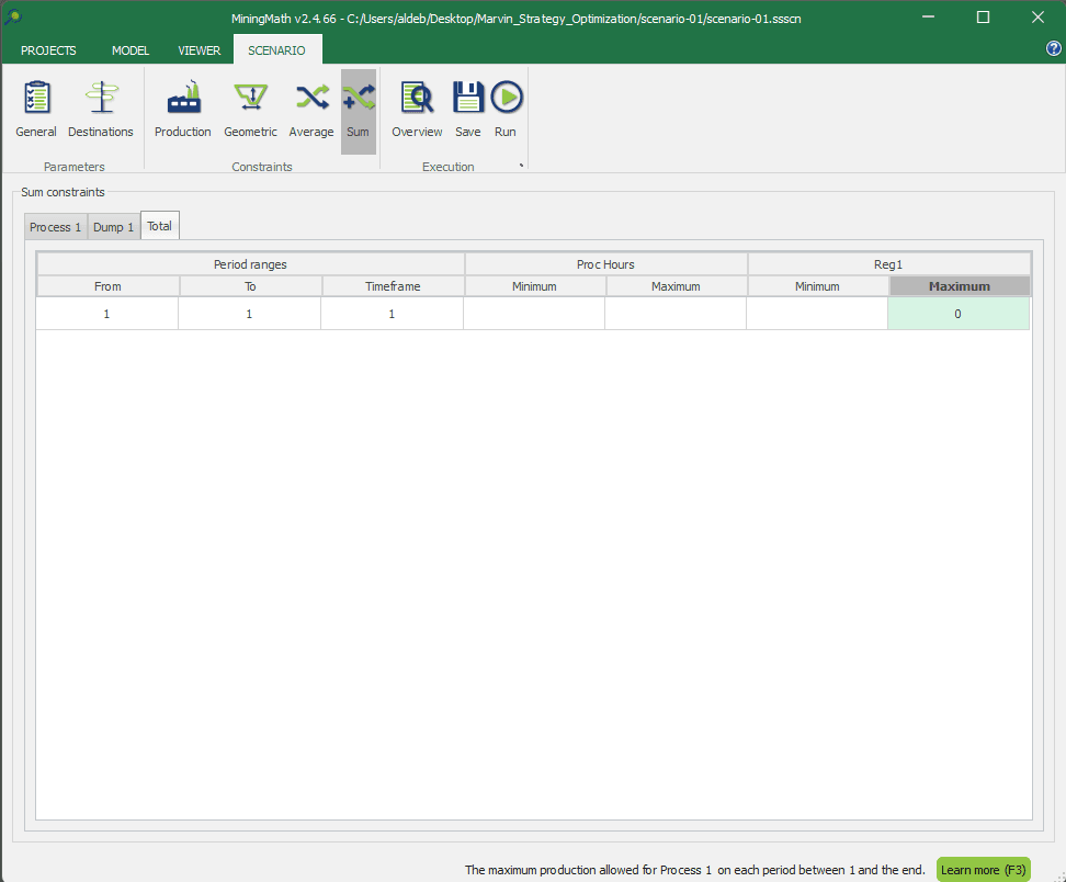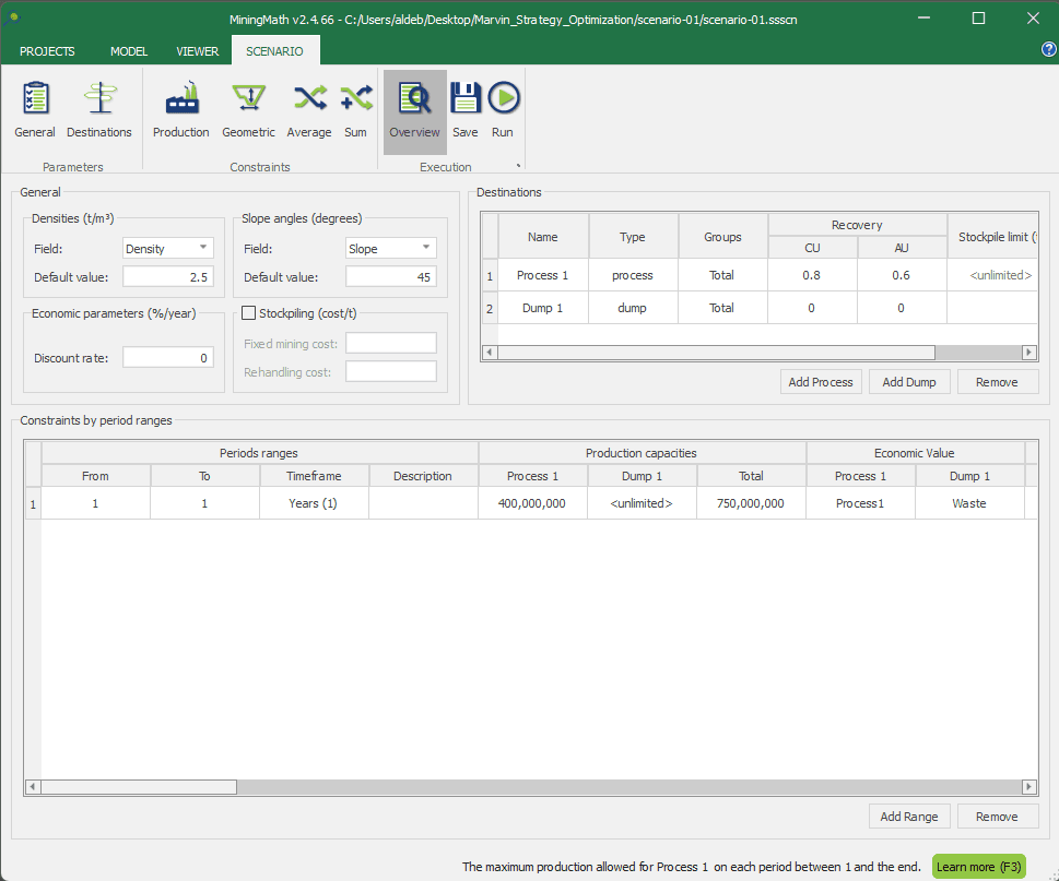 Crear un escenario de optimización de pozos donde la vida útil del pozo esté limitada a un período definido. Además, Incluir todas las restricciones del proyecto durante toda la vida útil de la mina. Para agilizar el proceso de optimización, Se recomienda evitar restricciones geométricas, ya que esto ayudará a reducir la complejidad.