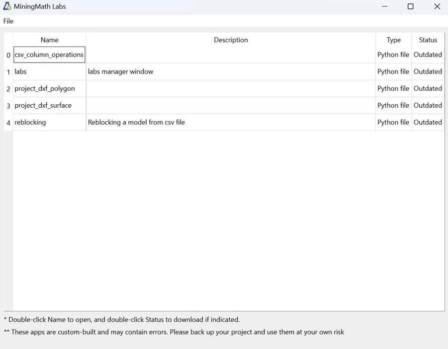 Los laboratorios son compactos, Herramientas integradas en la aplicación disponibles desde la versión 3.0.8 que permiten a los ingenieros editar archivos CSV, calcular estadísticas, y ajustar las entradas del modelo directamente dentro de MiningMath, lo que elimina la necesidad de software externo y reduce la repetición del trabajo manual.. Cada laboratorio (como csv_column_operations