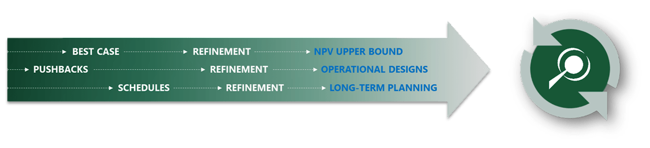 Otra estrategia para reducir el tiempo de ejecución podría ser el uso de plazos.. MiningMath permite la integración entre la visión de corto y largo plazo en el mismo proceso de optimización, facilitando el análisis y las definiciones estratégicas.