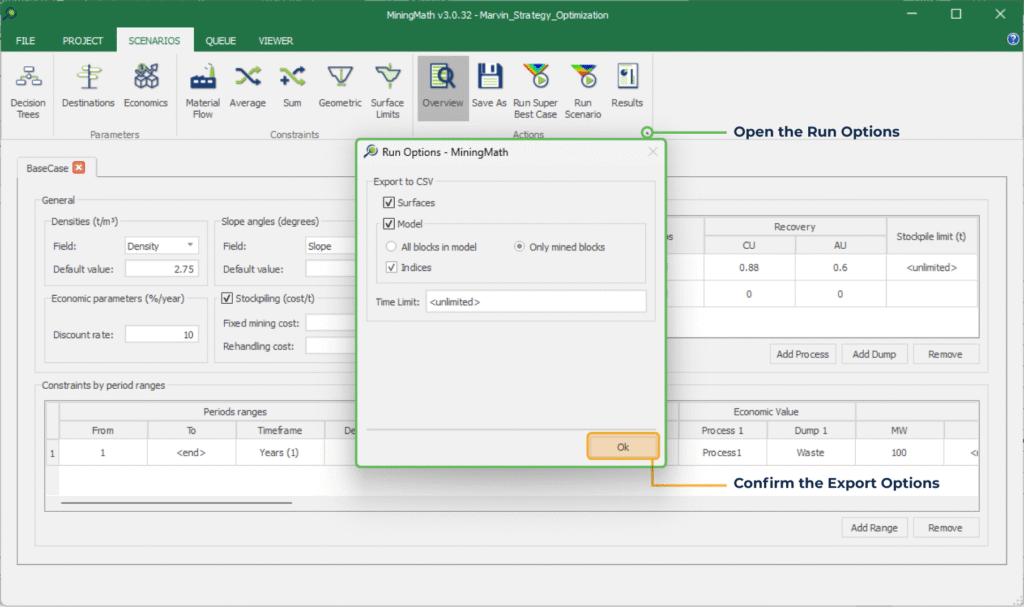 Los períodos de bloque y los destinos optimizados por el Super Best Case de MiningMath (o cualquier otro escenario) se puede exportar en formato CSV. Puede utilizar estos resultados para volver a importarlos a su paquete de minería preferido., para comparacion, diseño de retroceso o fines de programación. Las opciones de exportación se muestran a continuación..