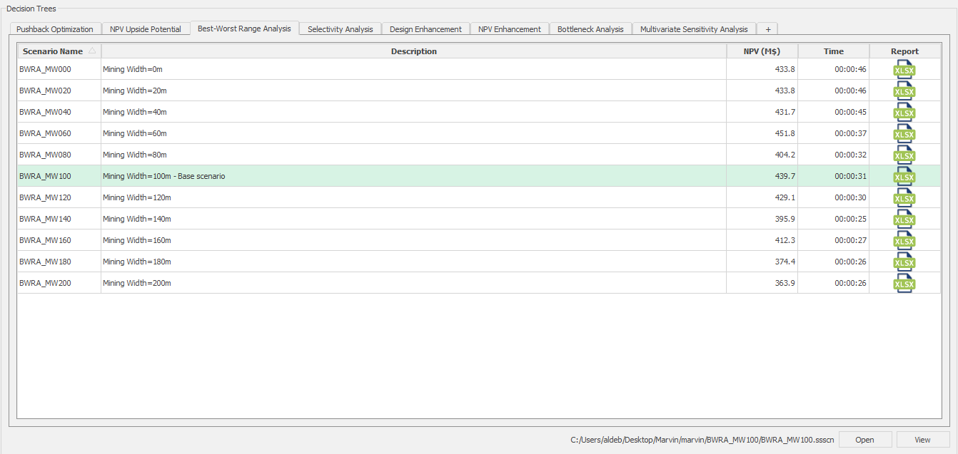 En un análisis de rango mejor-peor, Se crean escenarios gradualmente aumentar el ancho de la mina hasta un máximo factible, Permitir a los usuarios tener una visión integral del impacto de las limitaciones de espacio en el desempeño del proyecto..