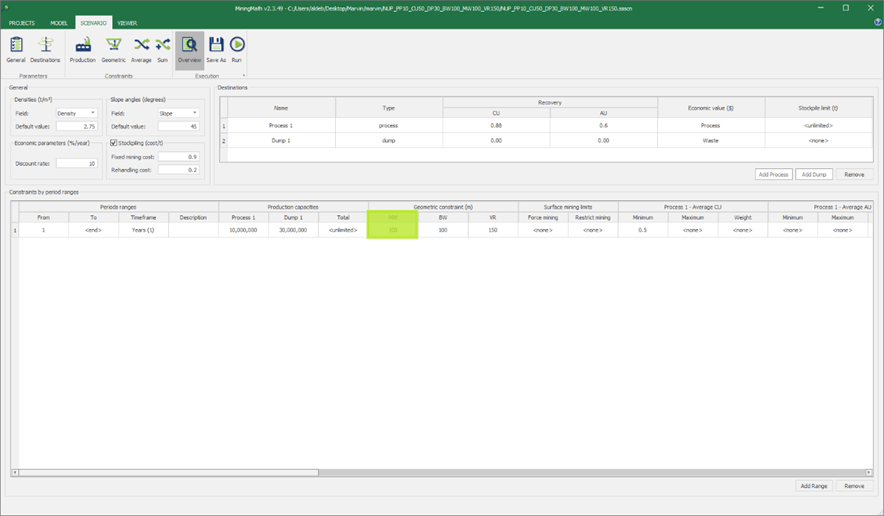 El objetivo en este caso es comprender el impacto de diferentes valores de ancho de minería (en verde), que se probará con un rango de diferentes valores, desde 0m hasta 200m.
