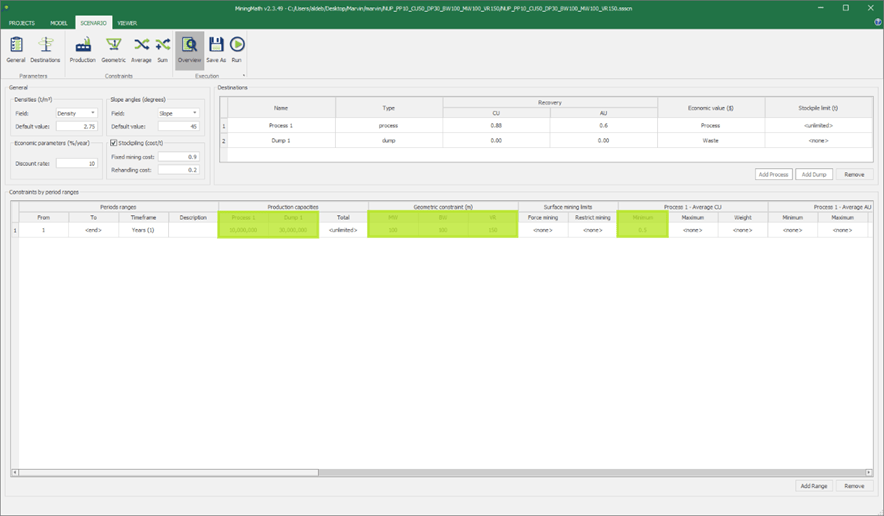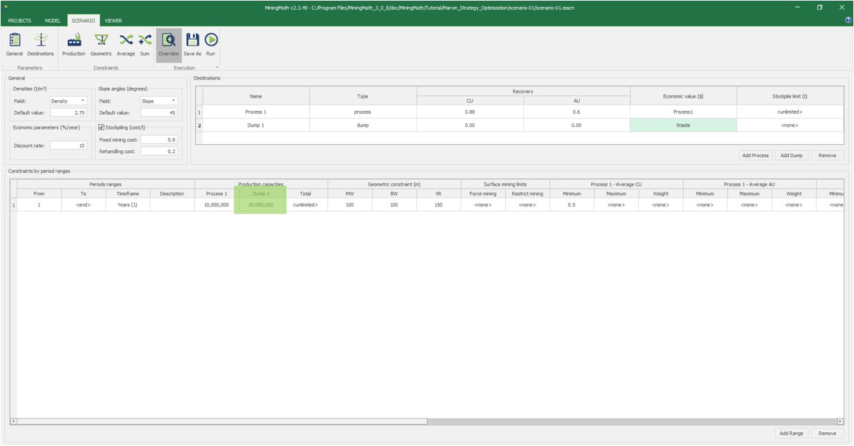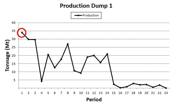 Considere el panorama del escenario base y el respectivo informe sobre la producción del vertedero.. Observe cómo el primer período ha violado la restricción de 30Mt.