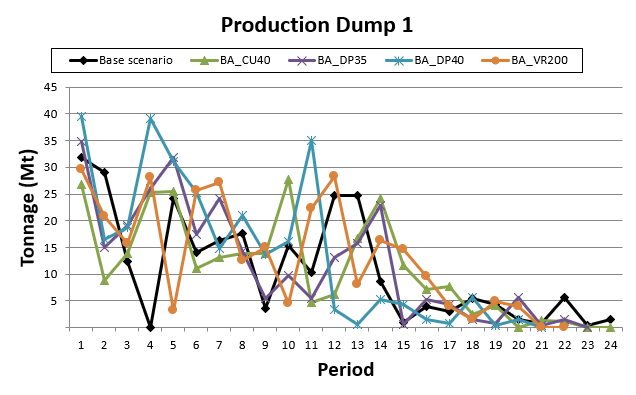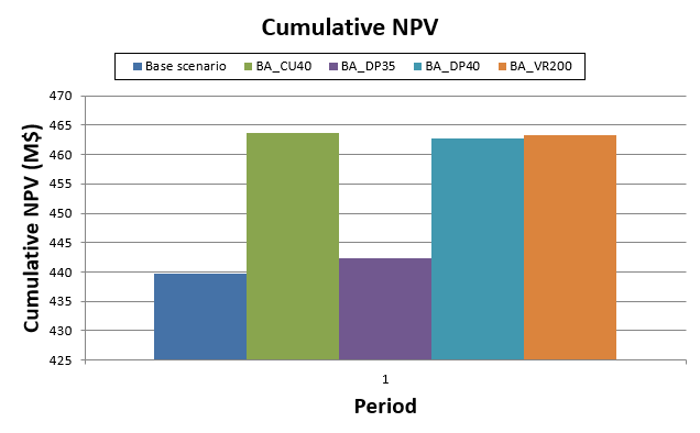 Este análisis muestra que la restricción media mínima de CU, el volcado de producción y la tasa de avance vertical están restringiendo el escenario base. Al relajar estos parámetros, hay un aumento de aproximadamente 5% en el VAN acumulado, mientras que las producciones del vertedero se mantienen dentro de sus límites y las producciones del proceso están más cerca del objetivo para algunos escenarios.