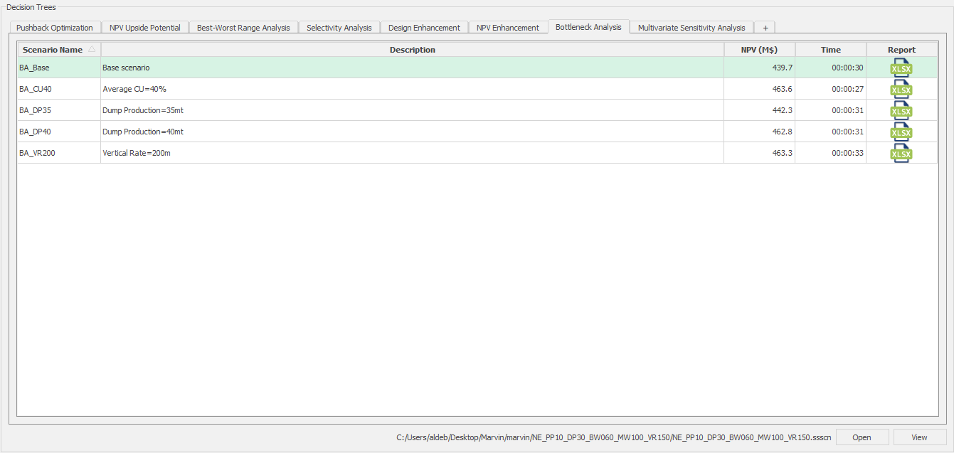 Un análisis de cuello de botella puede ayudarnos a identificar las restricciones con requisitos exigentes que impactan directamente los resultados de optimización y causan la violación en la producción del volcado.. Se construyen cuatro escenarios diferentes utilizando un árbol de decisión para analizar diferentes valores de límites de producción de volcado, promedio mínimo de CU y velocidad de avance vertical.