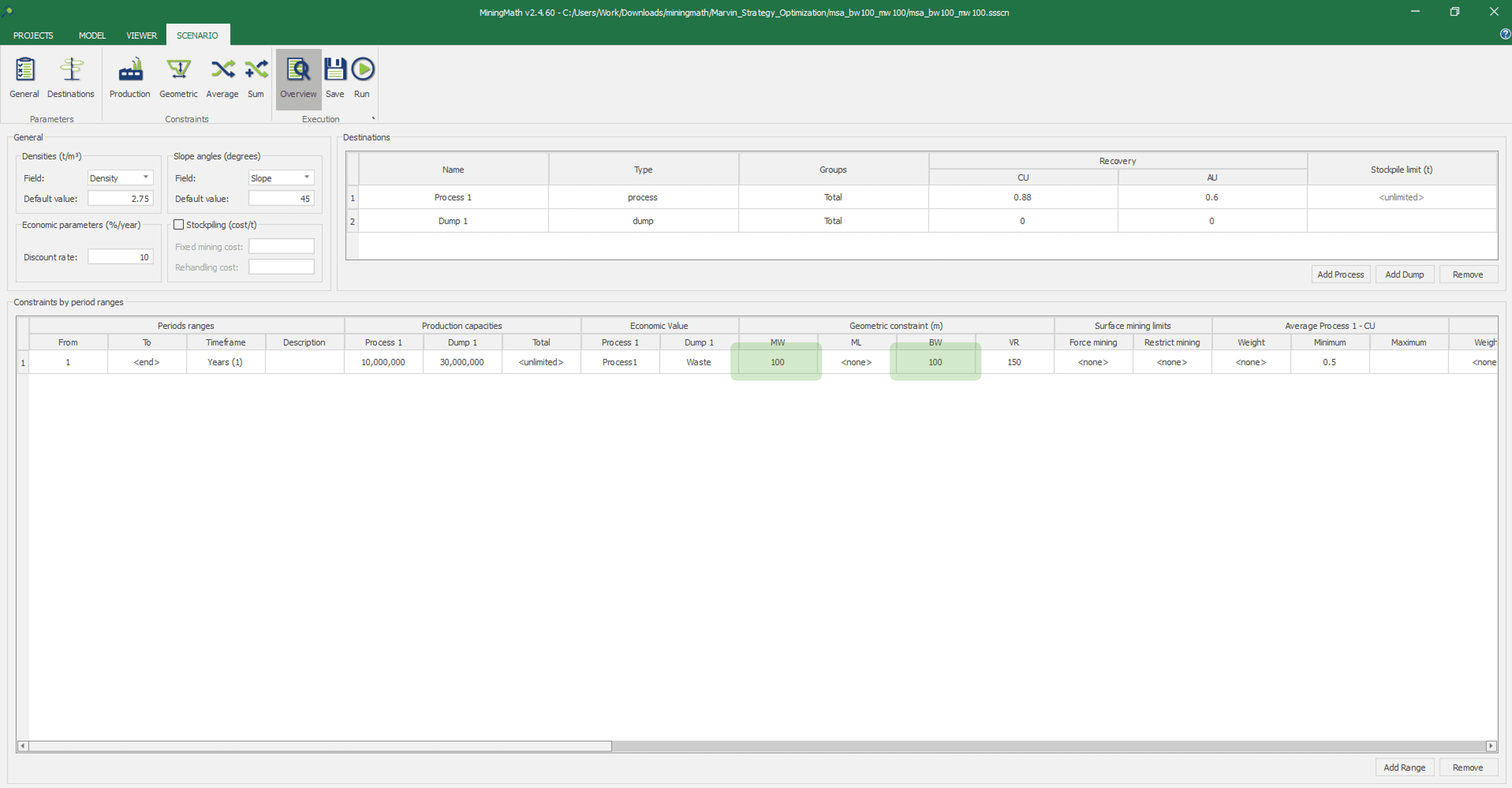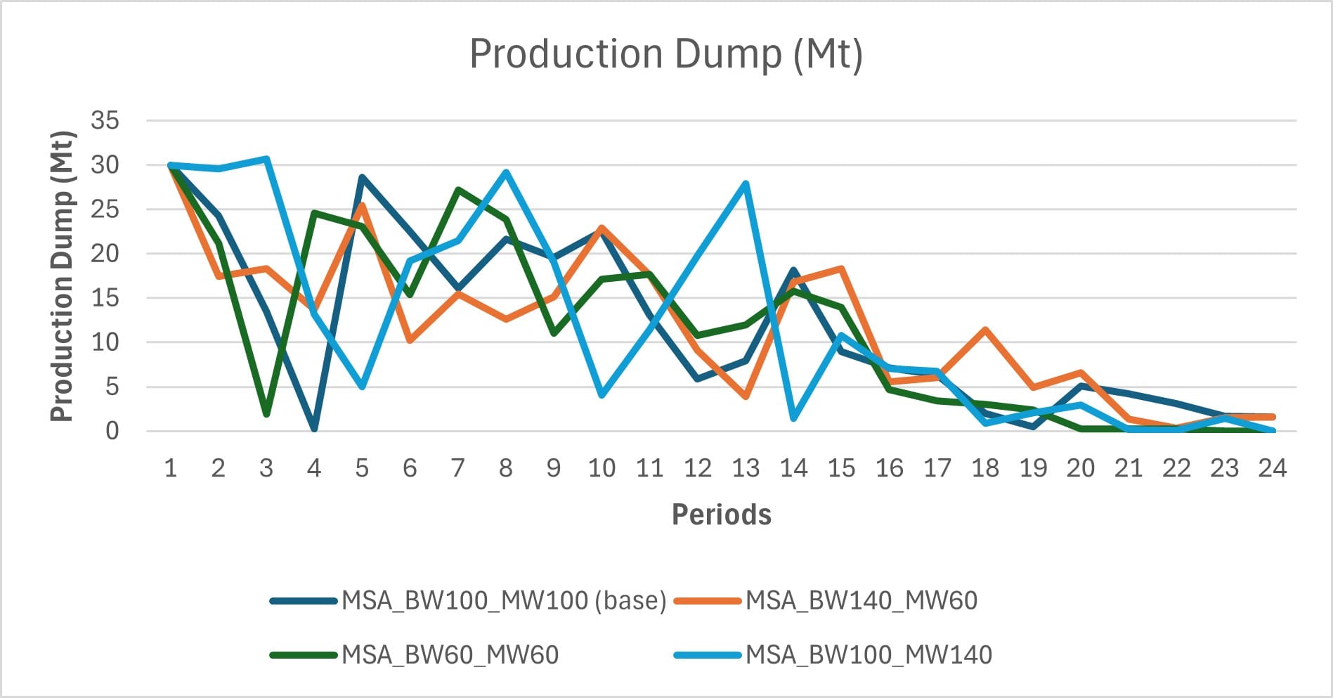El ejemplo proporcionado ilustra un análisis de sensibilidad multivariante., ofreciendo una evaluación básica basada en el VPN acumulado y la producción, mientras varía el ancho mínimo del fondo/minería. Análisis más profundos pueden requerir una inspección visual y/o el uso de indicadores adicionales., como la tasa de avance vertical. MiningMath informa advertencias para ciertas infracciones como se describe aquí.