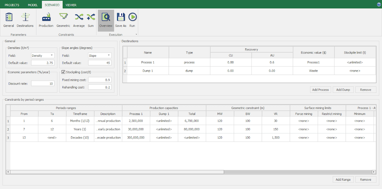 • Definir períodos más largos para las etapas posteriores de la vida de la mina., reduciendo los detalles donde son menos críticos y ahorrando tiempo de procesamiento para los primeros años, cuando la precisión es lo más importante.