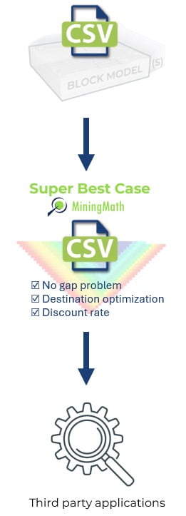 MineríaMatemáticas salidas trabajar esencialmente como retrocesos optimizados, con el objetivo de maximizar el VPN mientras se controla cualquier variable Tú eliges. Cuando importas con éxito superficies de MiningMath ( archivos) en otras aplicaciones, Sirven como guía. En otras palabras, Las superficies de MiningMath deberían ayudar a estas aplicaciones a encontrar VPN más altos. Muchas de estas aplicaciones ofrecen la opción de predefinir el destino de los bloques., Permitiéndole utilizar los destinos optimizados de MiningMath, Si lo deseas. Al final, Las demás aplicaciones se quedan entonces con la tarea exclusiva de realizar la programación del banco de pruebas de acuerdo con sus requisitos operativos/tácticos a corto plazo..