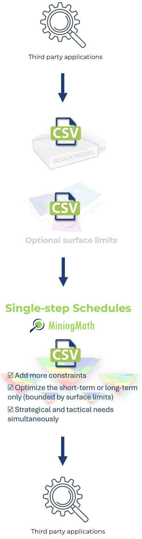 Con desarrollos constantes desde 2013, MiningMath ha evolucionado hasta convertirse en un estado maduro y robusto., proporcionando soluciones directamente desde el modelo de bloque. Es el primer y único motor de optimización de minería de un solo paso disponible en el mercado.!