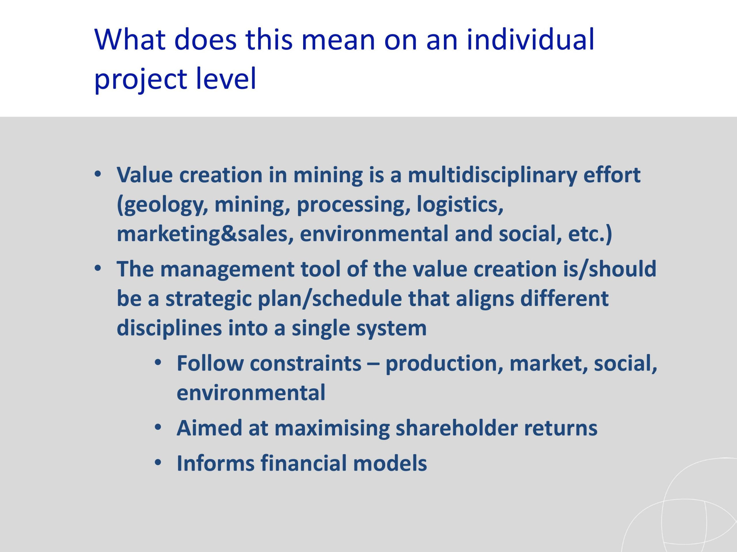 Este documento desafía la noción profundamente arraigada de que la creación de valor en la minería tiene que ver con la producción y los costos.. En cambio, plantea que se refiere principalmente a la capacidad de las empresas para aumentar continuamente los recursos minerales prospectivos y transformarlos en reservas minerales económicamente explotables de la manera más eficaz y eficiente. Para apoyar esta propuesta, este estudio busca demostrar que las empresas mineras que sobresalen en retorno total para los accionistas (TSR) a lo largo de todo un ciclo económico son los que también sobresalen en la expansión de sus reservas y producción, aquí referido como incremento total de reservas (TRI). La relación entre ambas variables es simple y reveladora: el precio de las acciones de la empresa es para las reservas minerales lo que los dividendos son para la producción.. Esta coincidencia da sentido económico al término 'depósito', que se utiliza en el lenguaje minero para referirse a un cuerpo de mineral. Resultados obtenidos de un grupo diverso de 14 empresas mineras durante el período 2000-2009 demostrar la hipótesis anterior. Hay dos casos dudosos, pero como sugiere el documento, estas son empresas en transición en el proceso de convertir recursos minerales prometedores en reservas minerales., que el mercado anticipa.