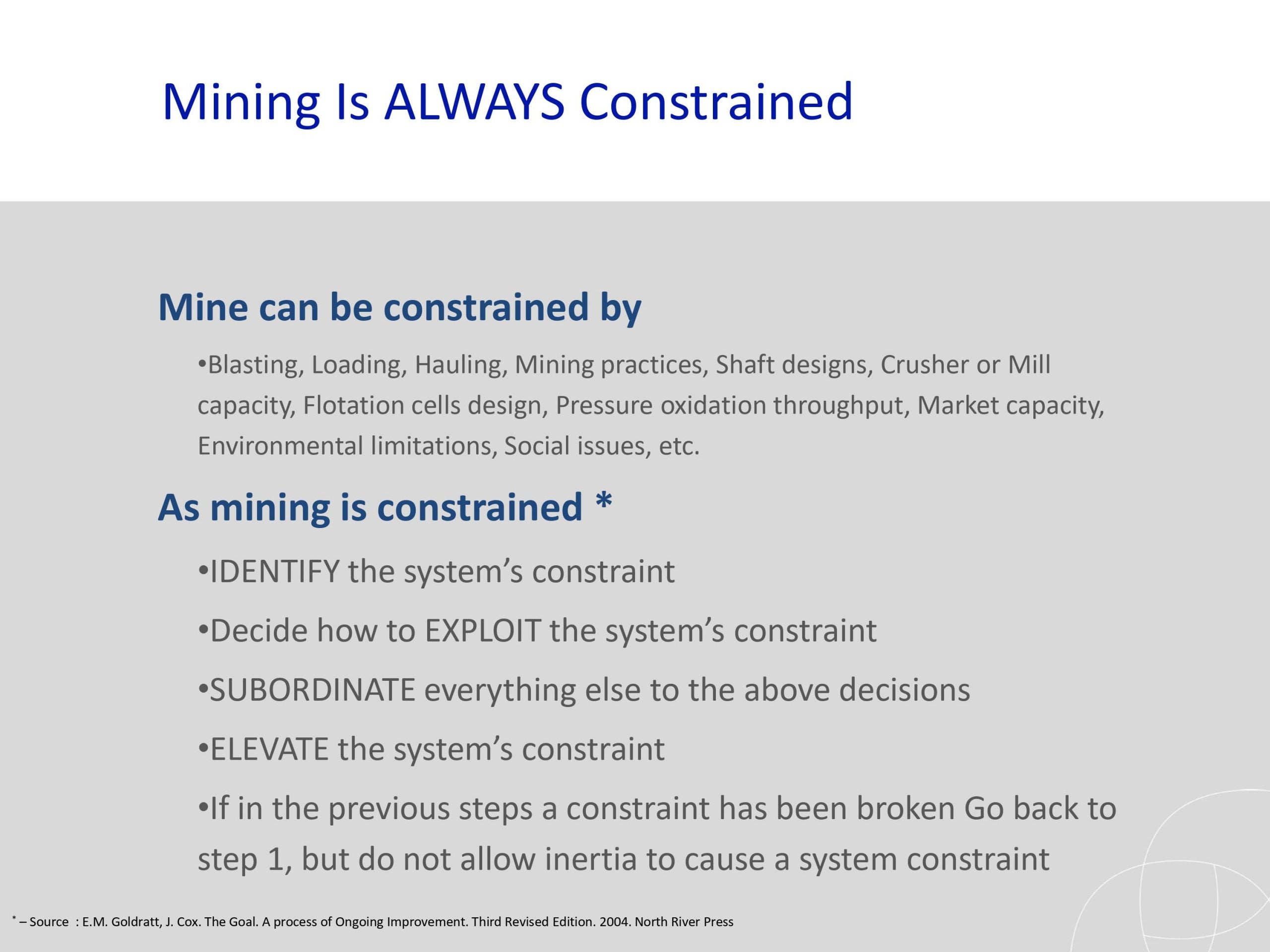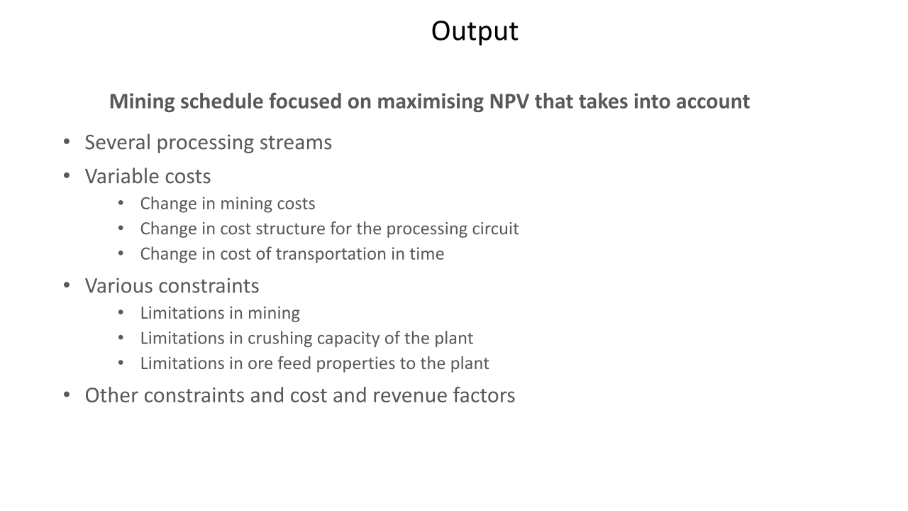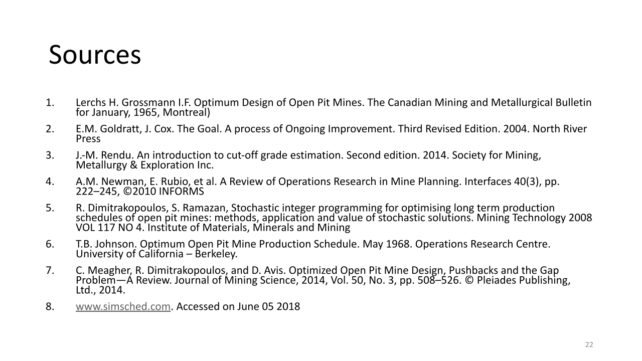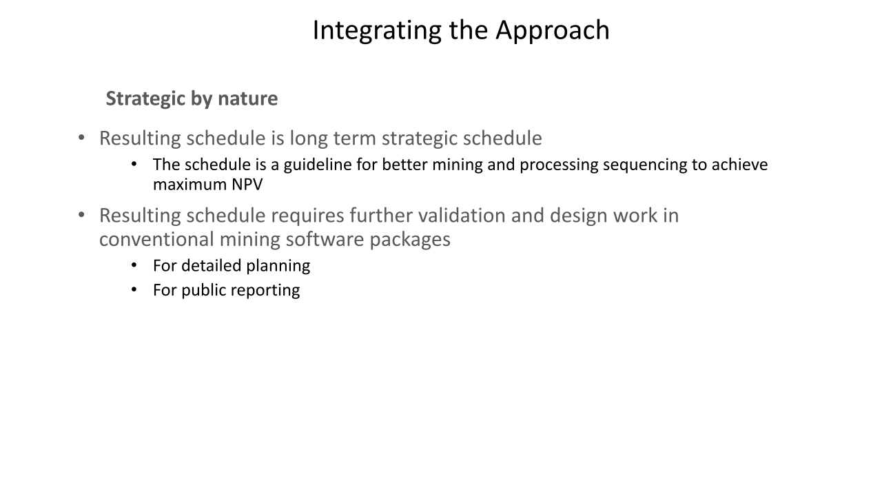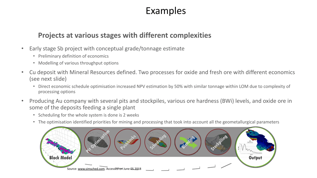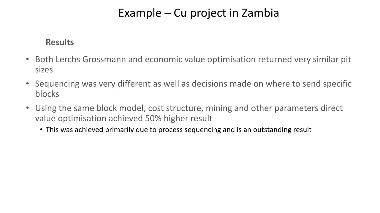 Los resultados y los estudios de casos presentados han ilustrado el potencial que puede ofrecer una optimización global para reducir los riesgos y mejorar el rendimiento general de un proyecto minero.. El análisis del riesgo de incertidumbre también se ha abordado como un nivel completamente nuevo para hacer frente a los desafíos a largo plazo para un campo que enfrenta nuevas demandas de la sociedad..