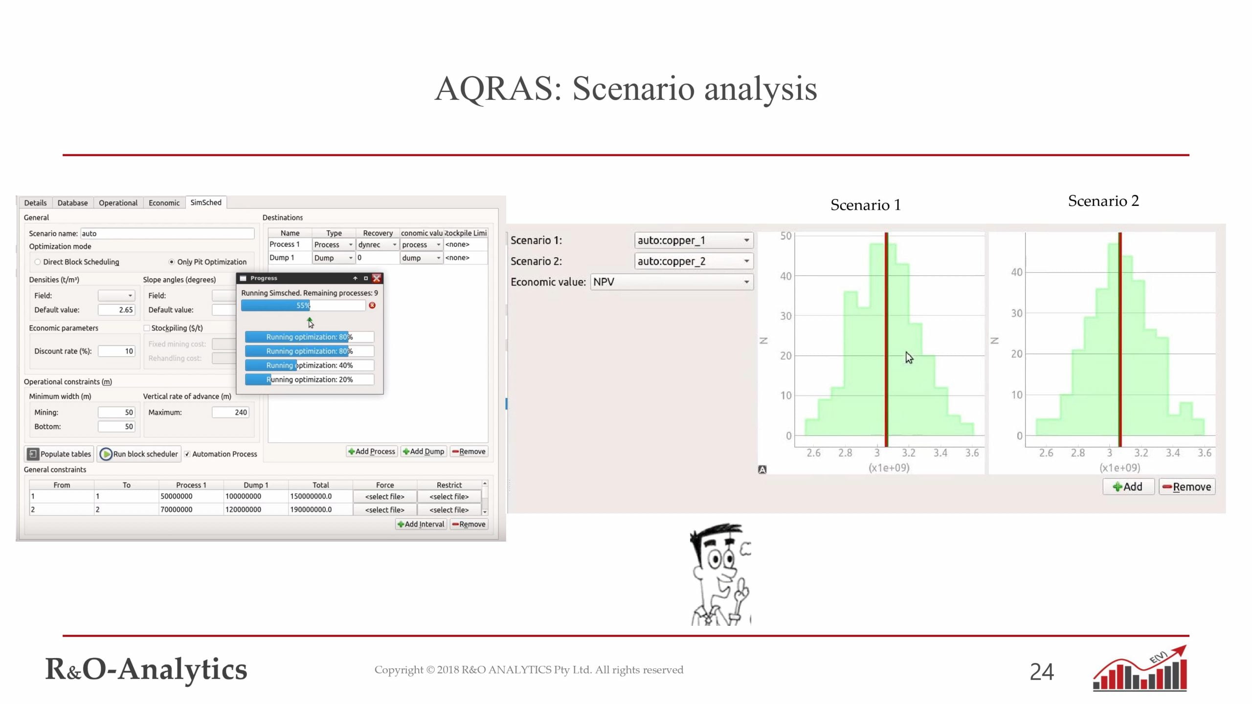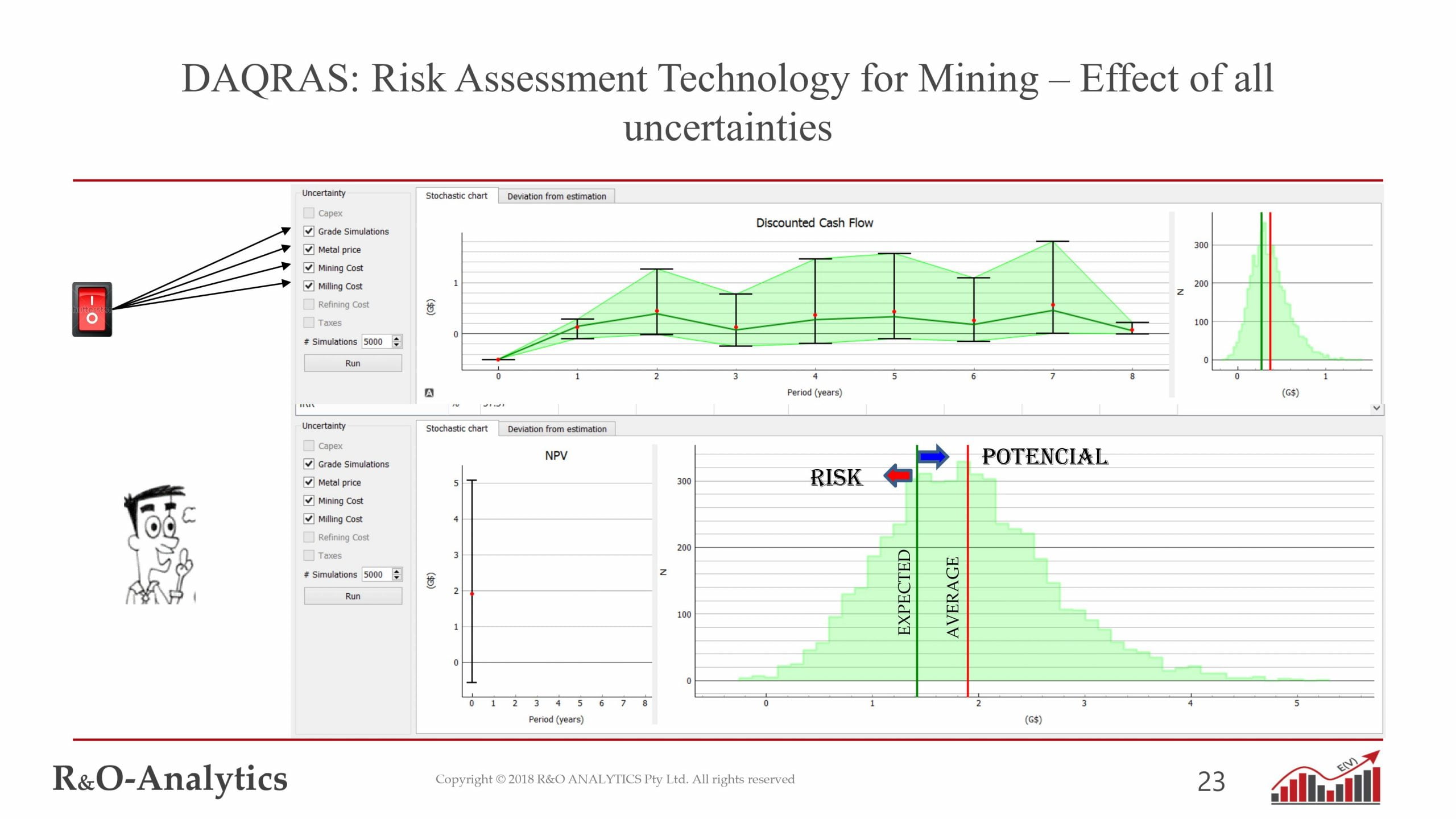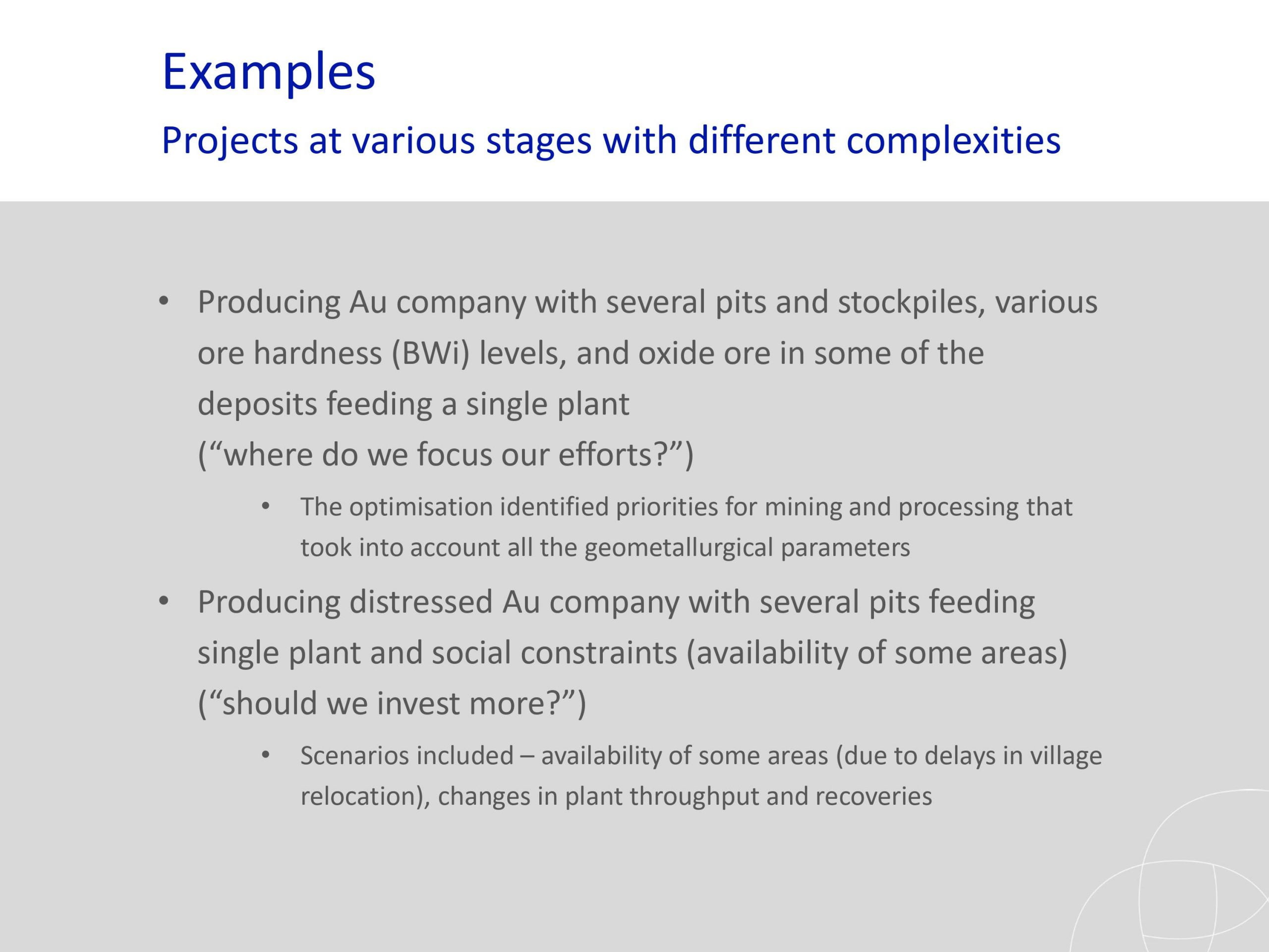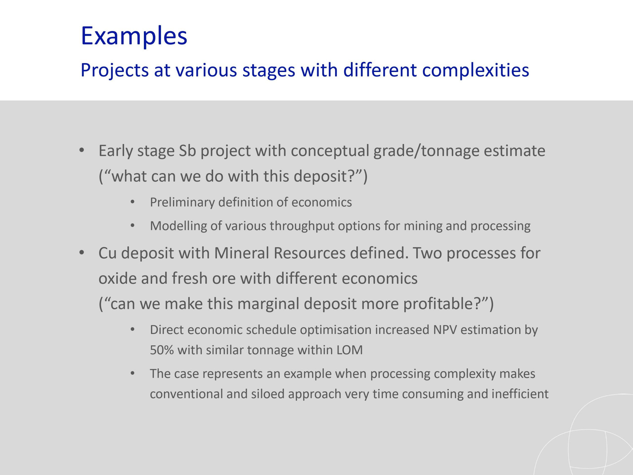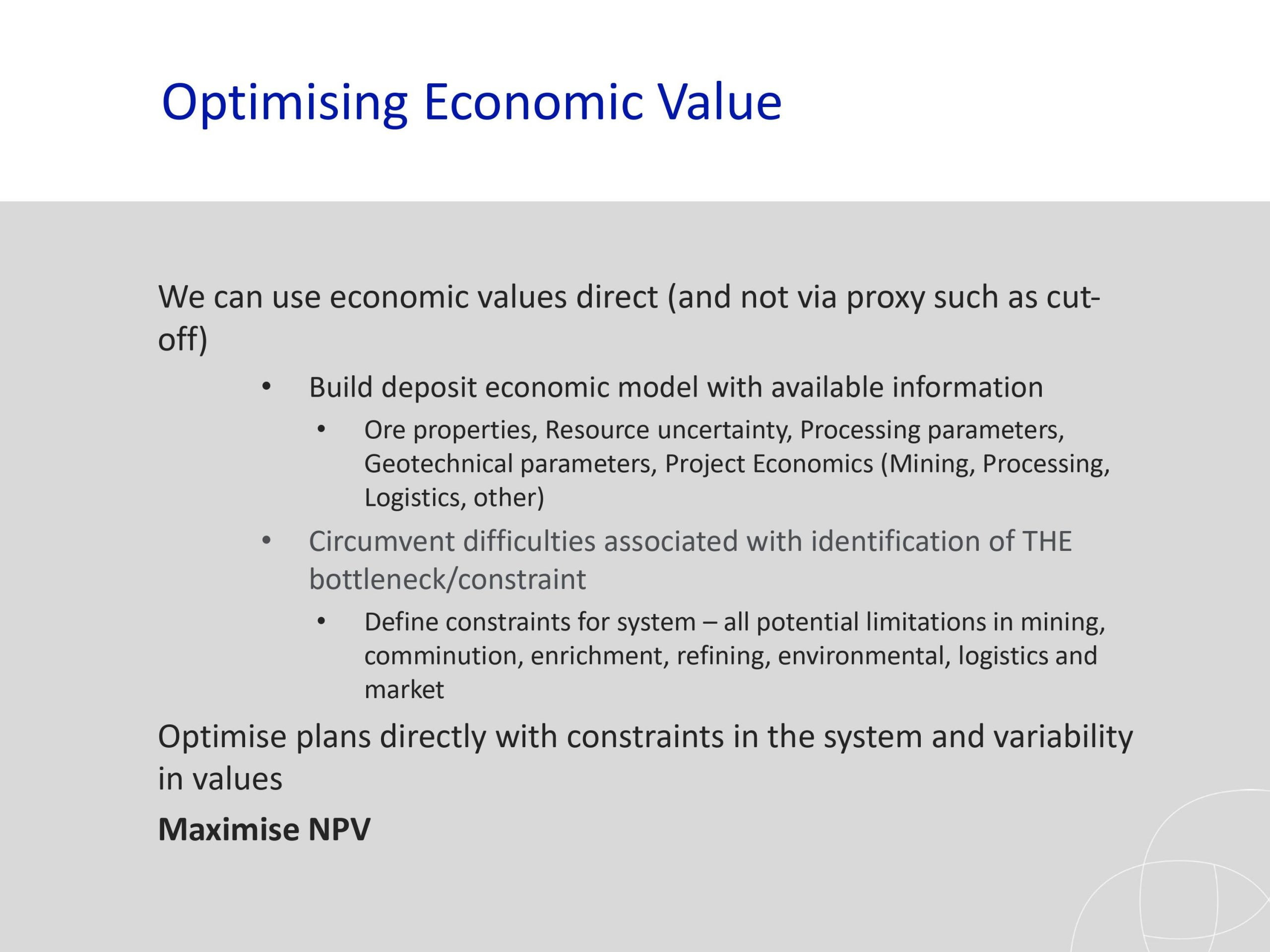 Los resultados y los estudios de casos presentados han ilustrado el potencial que puede ofrecer una optimización global para reducir los riesgos y mejorar el rendimiento general de un proyecto minero.. El análisis del riesgo de incertidumbre también se ha abordado como un nivel completamente nuevo para hacer frente a los desafíos a largo plazo para un campo que enfrenta nuevas demandas de la sociedad..