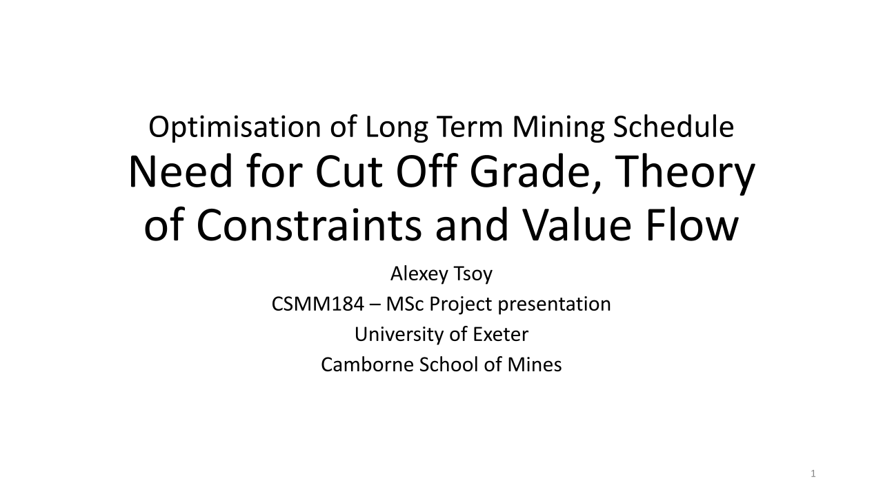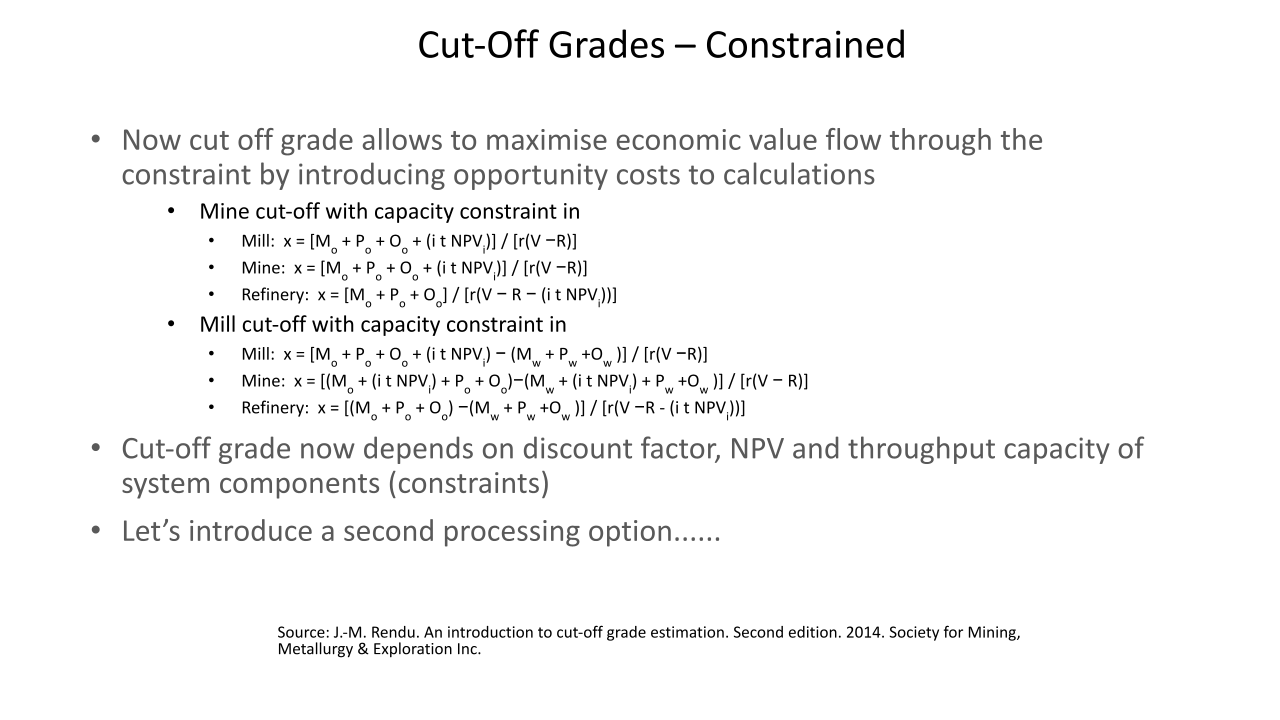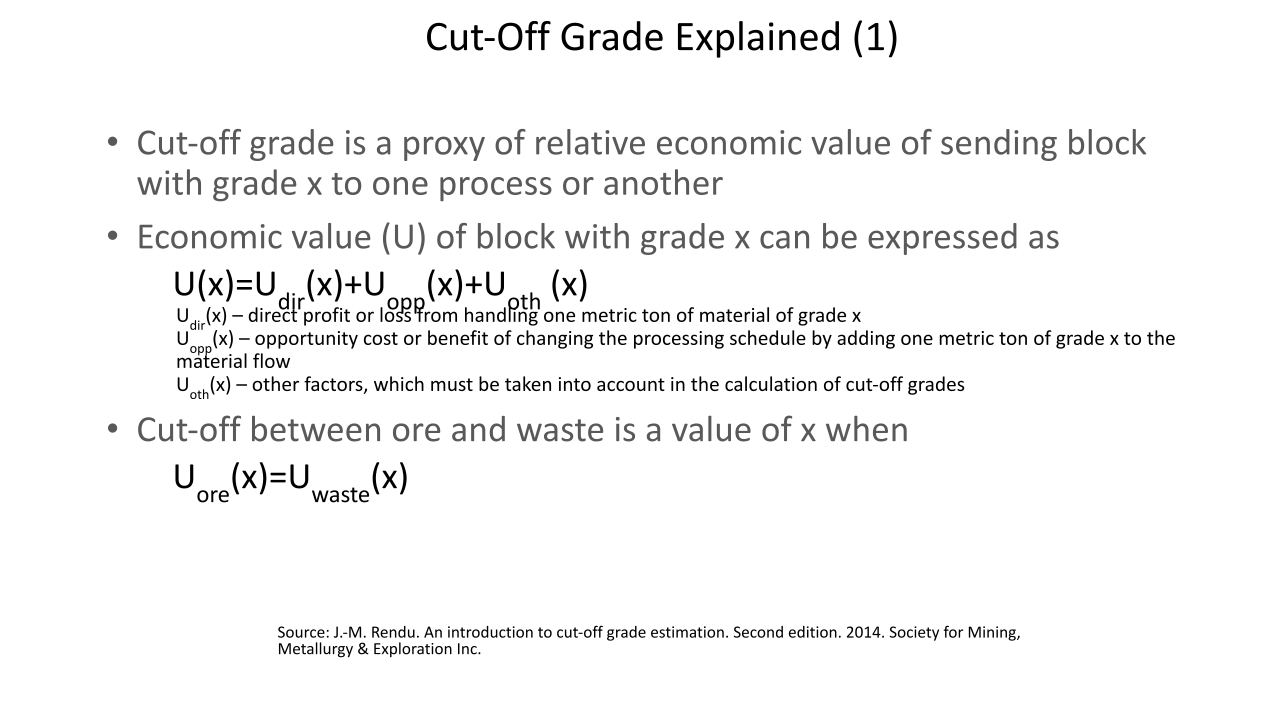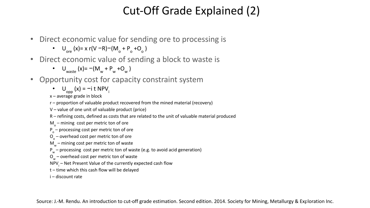 La optimización de la ley de corte es crucial para cualquier organización minera. El material se clasifica en roca., mineral o producto. La ley es la relación entre la cantidad de producto y la cantidad de mineral que lo contiene.. La ley del bloque mineralizado se puede expresar en gramos por tonelada. (g/tonelada), como un porcentaje (%), grado de metal equivalente por tonelada o valor en dólares por tonelada. La ley de corte es la ley que se utiliza para distinguir entre el mineral y el desecho durante la programación.. La ley de corte es el principal generador de valor en una operación minera. Una ley de corte alta da como resultado menos reservas. Es importante optimizar la ley de corte durante la vida útil de la mina para optimizar el valor presente neto. Hay varias partes interesadas que obtienen beneficios de una operación minera cuyo interés debe ser considerado durante la optimización de la ley de corte. Los escenarios investigados han demostrado que operar una mina con base en la ley de corte de equilibrio no optimiza el valor actual neto de una operación según lo indican los resultados de Ruashi Mining.. También se ha demostrado que la regalía afecta la ley de corte de Ruashi Mining.. La curva ley-tonelaje es más pronunciada al principio, lo que implica que un pequeño cambio en la ley de corte tiene un gran impacto en las reservas.. La optimización de la ley de corte en SimSched da como resultado una política de ley de corte fuertemente decreciente en comparación con NPVS. La optimización en SimSched da como resultado una tasa de minería muy acelerada y un almacenamiento masivo. Pero SimSched ofrece un VPN más alto en comparación con el cronograma actual de la vida útil de la mina de Ruashi.. Esto implica que SimSched se puede utilizar para mejorar el VAN de Ruashi mediante la producción de una política de ley de corte optimizada..