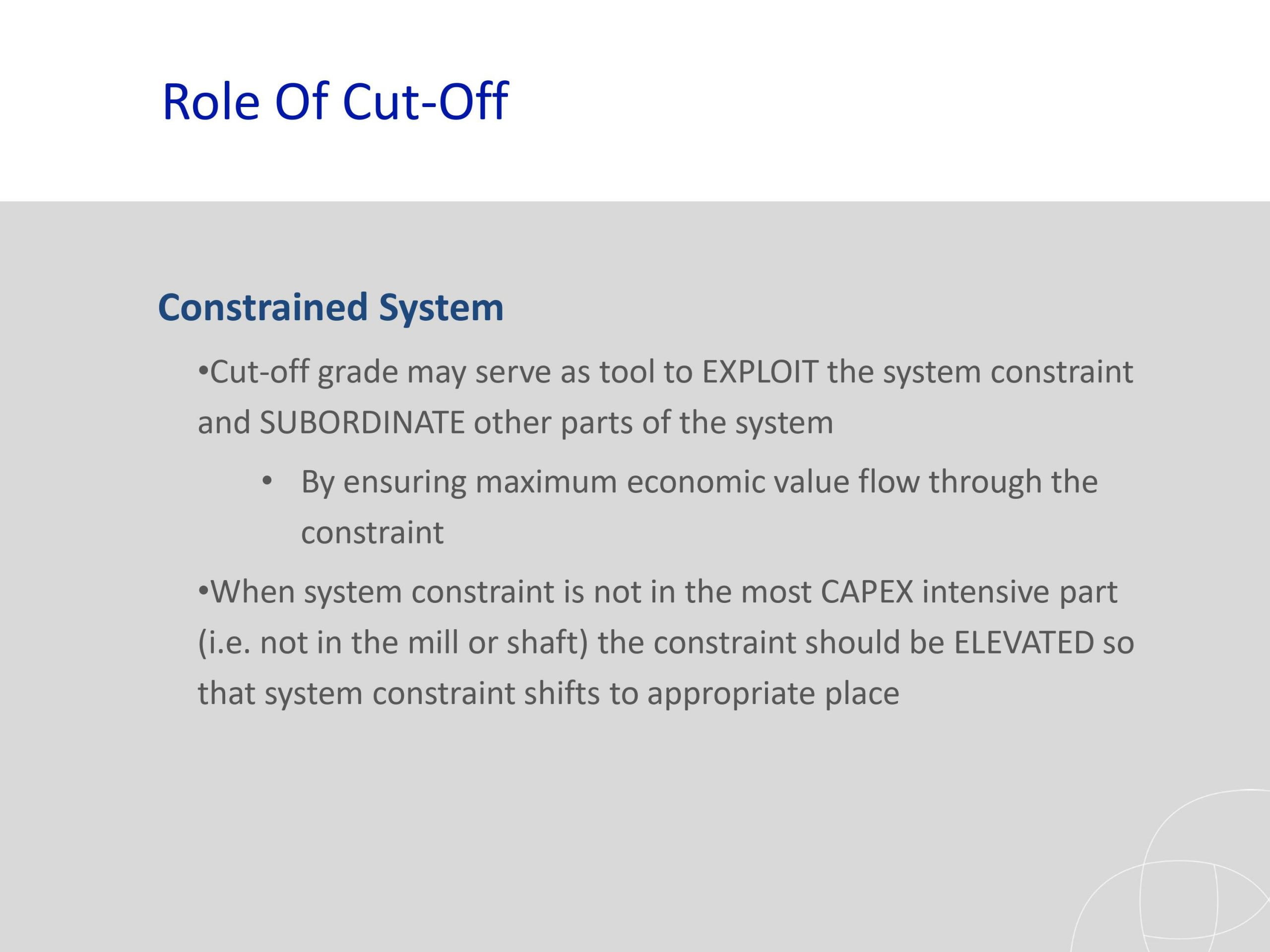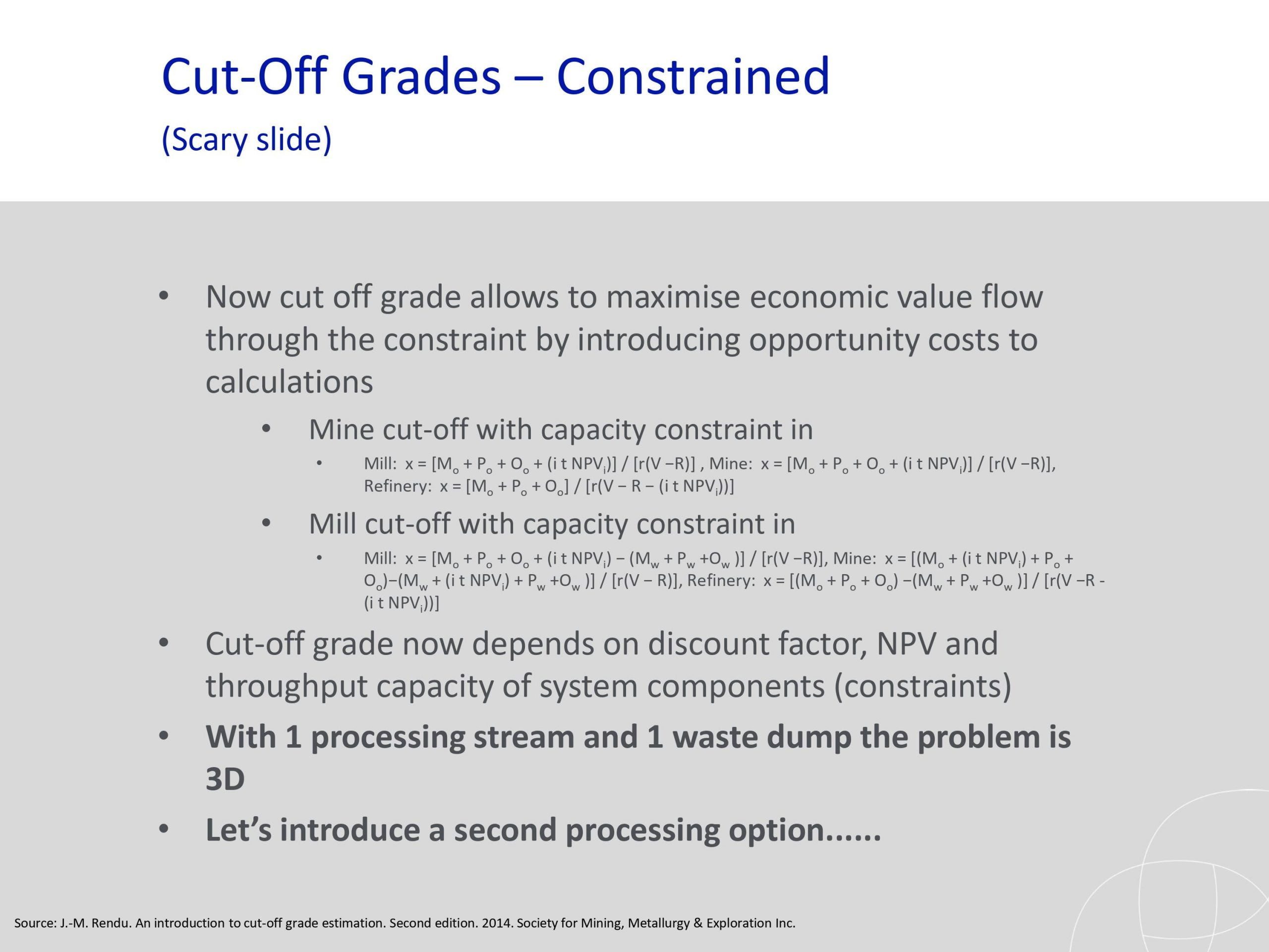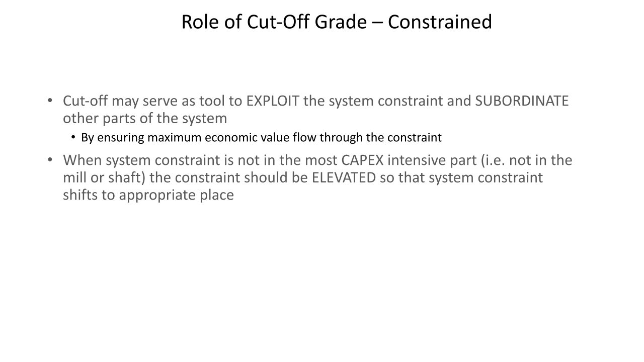 La optimización de la ley de corte es crucial para cualquier organización minera. El material se clasifica en roca., mineral o producto. La ley es la relación entre la cantidad de producto y la cantidad de mineral que lo contiene.. La ley del bloque mineralizado se puede expresar en gramos por tonelada. (g/tonelada), como un porcentaje (%), grado de metal equivalente por tonelada o valor en dólares por tonelada. La ley de corte es la ley que se utiliza para distinguir entre el mineral y el desecho durante la programación.. La ley de corte es el principal generador de valor en una operación minera. Una ley de corte alta da como resultado menos reservas. Es importante optimizar la ley de corte durante la vida útil de la mina para optimizar el valor presente neto. Hay varias partes interesadas que obtienen beneficios de una operación minera cuyo interés debe ser considerado durante la optimización de la ley de corte. Los escenarios investigados han demostrado que operar una mina con base en la ley de corte de equilibrio no optimiza el valor actual neto de una operación según lo indican los resultados de Ruashi Mining.. También se ha demostrado que la regalía afecta la ley de corte de Ruashi Mining.. La curva ley-tonelaje es más pronunciada al principio, lo que implica que un pequeño cambio en la ley de corte tiene un gran impacto en las reservas.. La optimización de la ley de corte en SimSched da como resultado una política de ley de corte fuertemente decreciente en comparación con NPVS. La optimización en SimSched da como resultado una tasa de minería muy acelerada y un almacenamiento masivo. Pero SimSched ofrece un VPN más alto en comparación con el cronograma actual de la vida útil de la mina de Ruashi.. Esto implica que SimSched se puede utilizar para mejorar el VAN de Ruashi mediante la producción de una política de ley de corte optimizada..