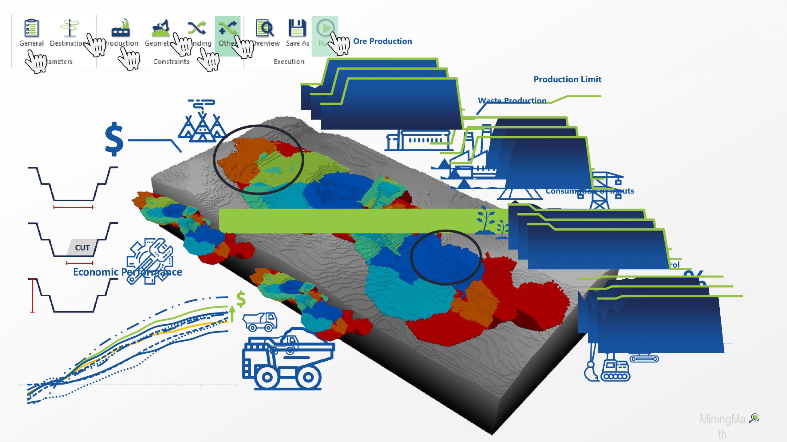 MiningMath permite la inclusión de datos por bloque en el modelo, como el potencial de calentamiento global para..."