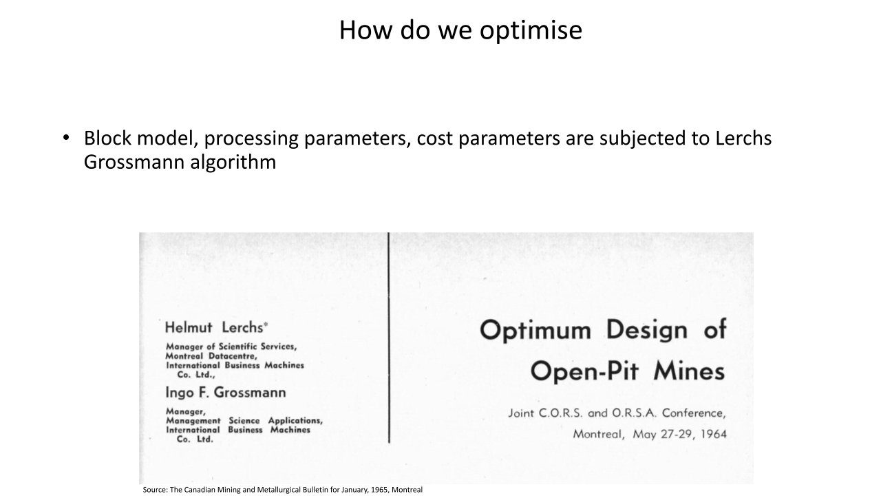 Este documento desafía la forma actual en que se determinan en la práctica la secuencia de la mina y la capacidad de la mina en la minería a cielo abierto.. El primero suele determinarse mediante el algoritmo de Lerchs-Grossmann (LG) mientras que este último utiliza una regla general que involucra la productividad del equipo de la mina y / o una tasa de hundimiento de banco preventiva. El advenimiento de software y hardware más capaces ha permitido recientemente la creación de aplicaciones de minería más eficientes para resolver el problema de la secuencia de minería.. Pero sus resultados teóricos corren el riesgo de ser etiquetados como poco prácticos si no se comprende bien el problema de la capacidad de la mina..
